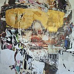 Kleurrijk abstract mixed media schilderij, opgebouwd uit diverse lagen (dekkend en transparant) en met verschillende materialen.